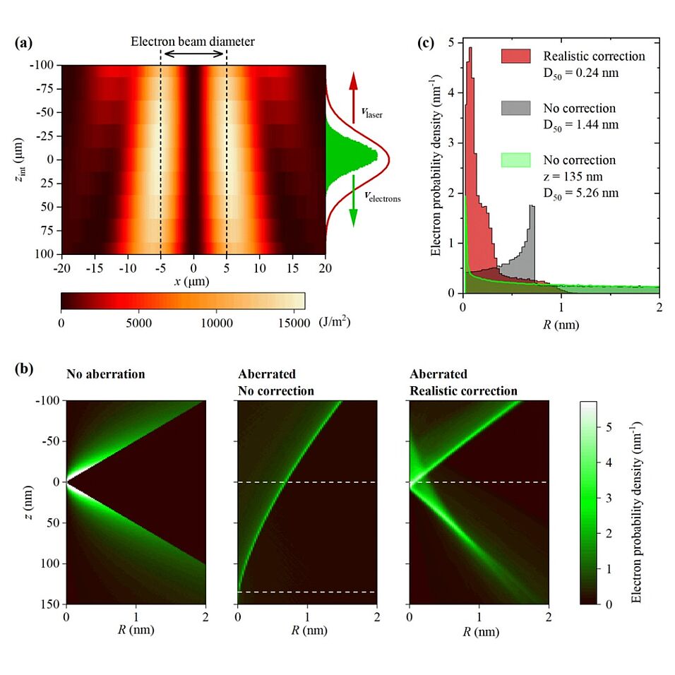 Aberration correction is crucial for achieving atomic resolution in electron microscopy. While conventional correctors use multipolar electron lenses, our work explores a fundamentally different approach tailored specifically for ultrafast electron microscopes operating in pulsed mode. We propose using spatially structured intense laser pulses to manipulate electron wave fronts via free-space electron-photon interactions. Our simulations demonstrate that such laser fields can effectively compensate for the spherical and chromatic aberrations of subsequent magnetic lenses, resulting in substantial improvements in probe size. These findings pave the way for optical elements designed for ultrafast electron microscopy.
